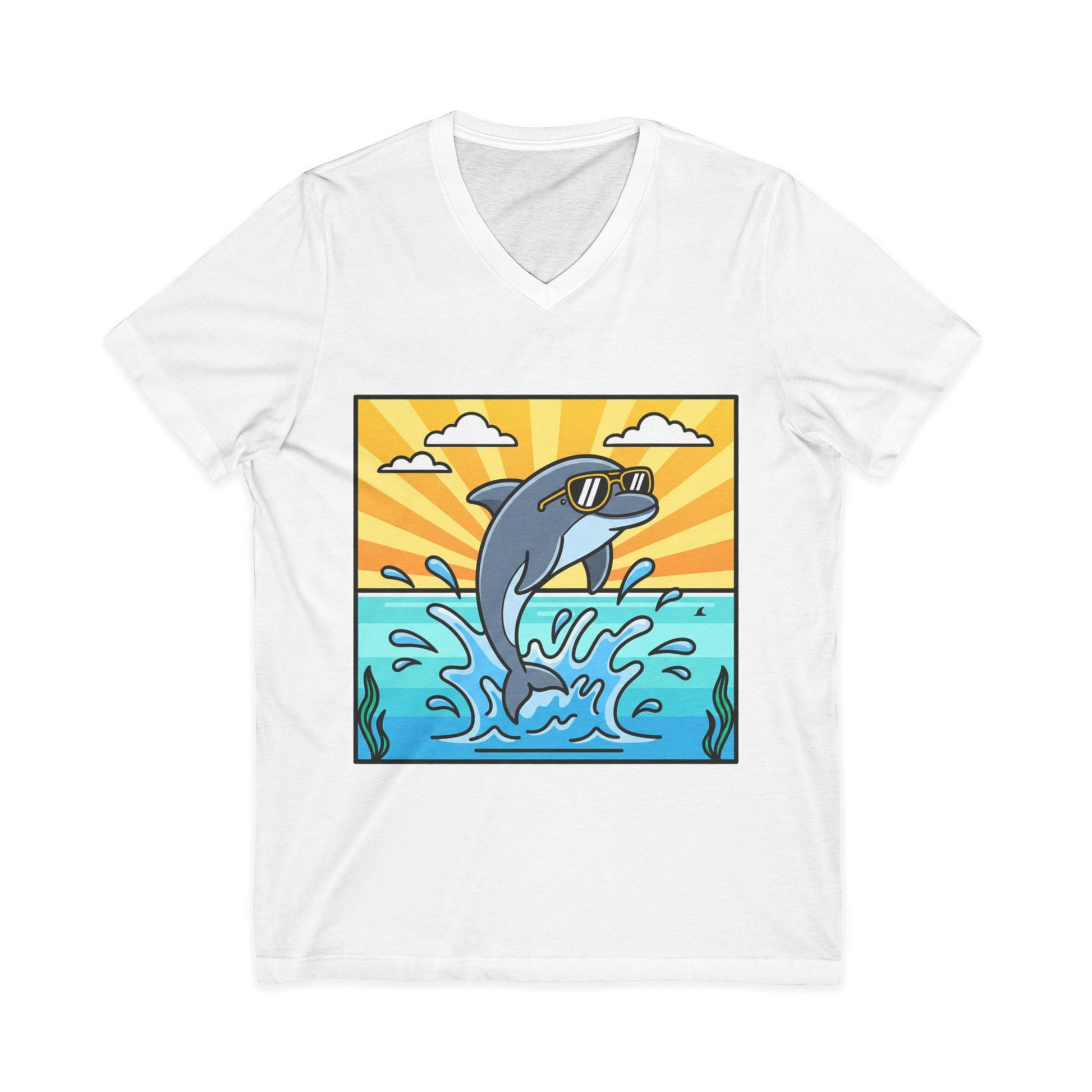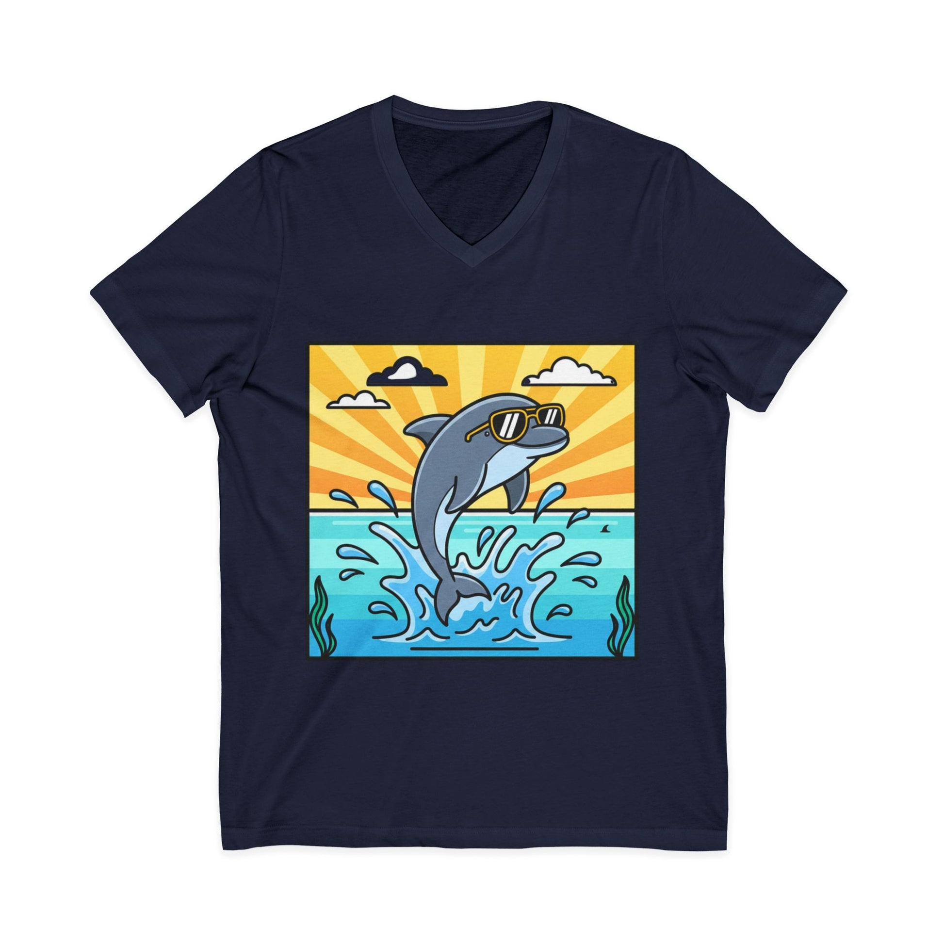When a dolphin leaps through sunrise rays, shades on, mid-flight and full of joy—that's pure ocean energy. This V-neck tee captures that playful, sunlit moment with a stylized design that celebrates the kind of carefree confidence that comes from living close to the water. It's for people who know that the best days start with salt air, end with sunset, and are filled with moments worth celebrating.
