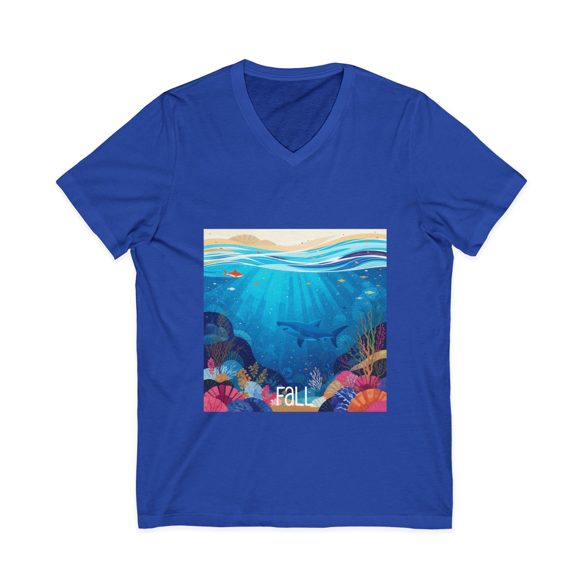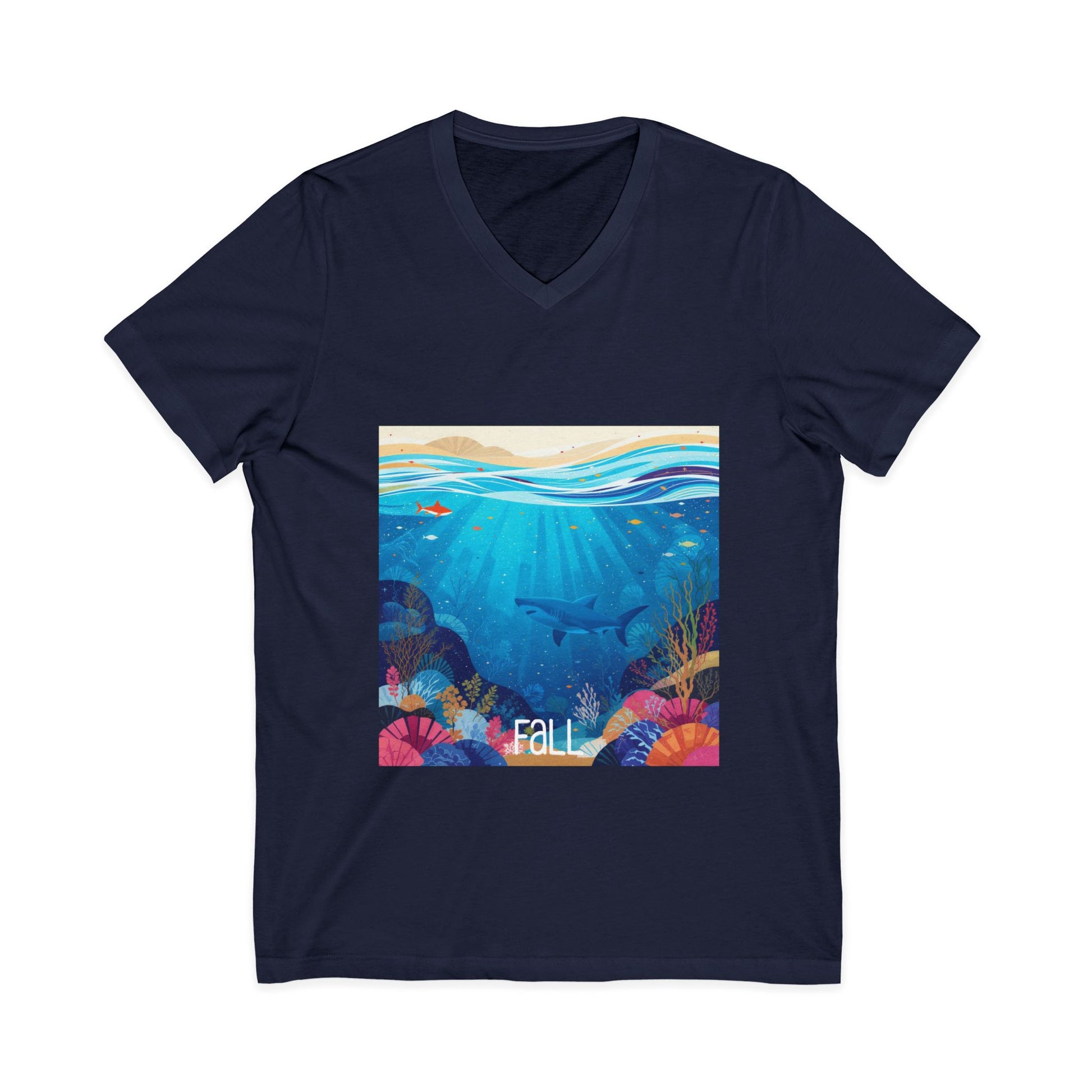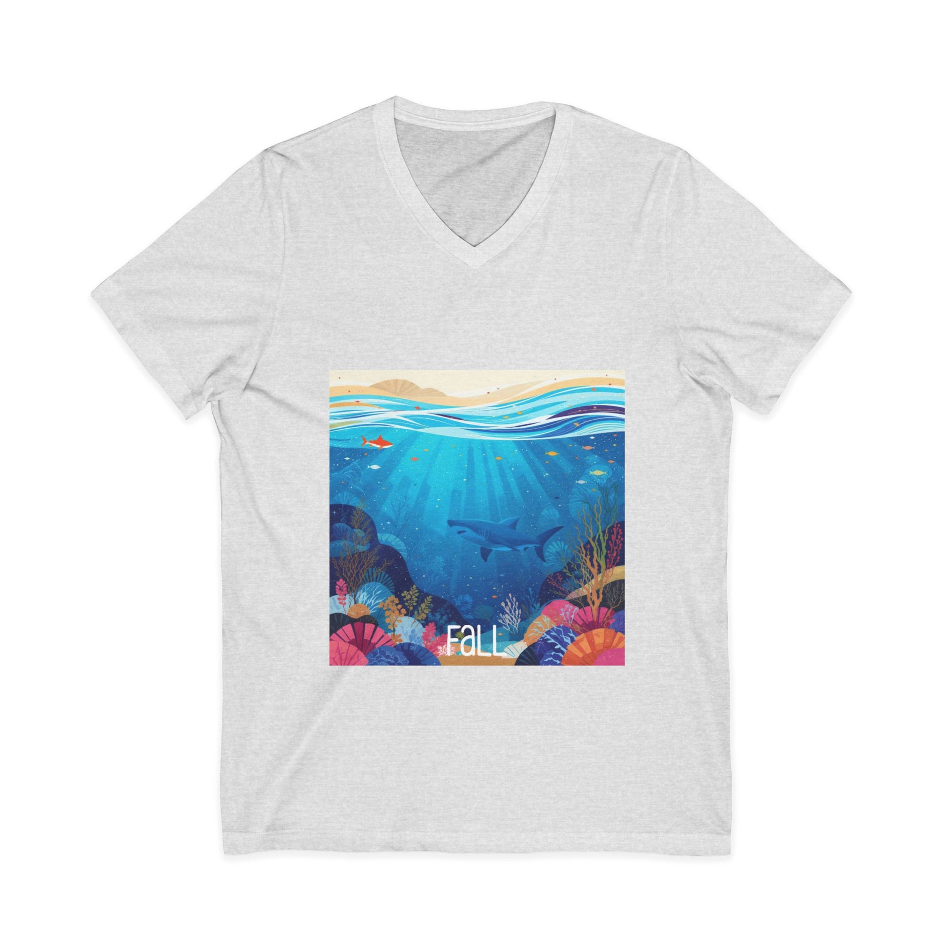 As autumn arrives, the ocean shifts—cooler currents, changing light, and sharks adapting to the season. This v-neck tee captures that transitional beauty with warm, illustrated underwater tones perfect for ocean lovers who embrace every season.