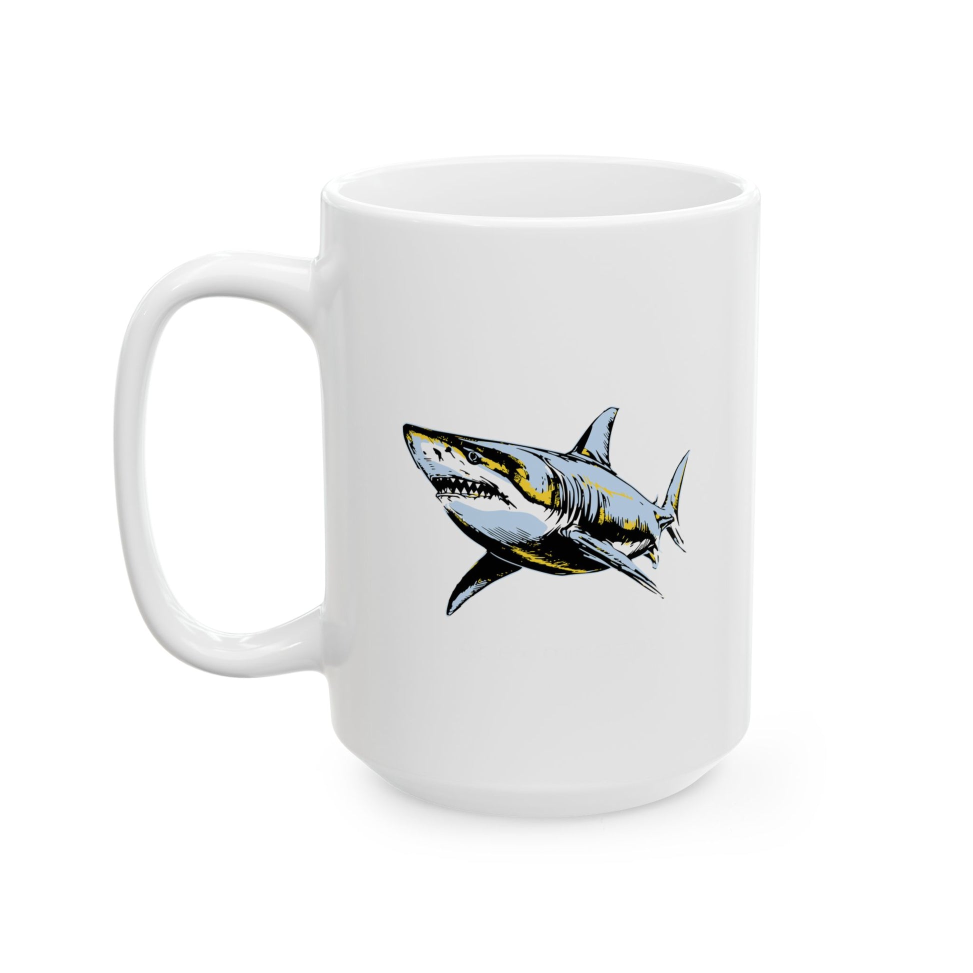 Your morning coffee just got sharper. This glossy ceramic mug features a bold shark illustration with ocean-inspired lettering—crisp, vibrant, and unmistakably coastal. Perfect for shark lovers who want to bring that deep blue energy to every sip.