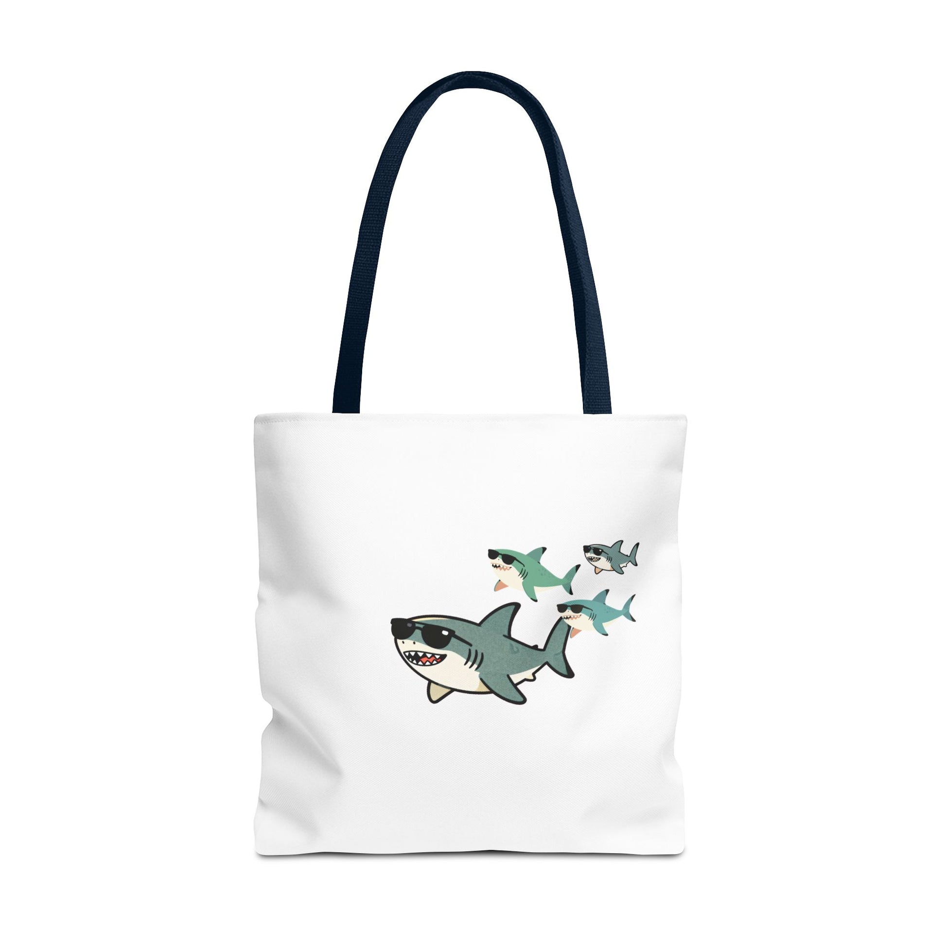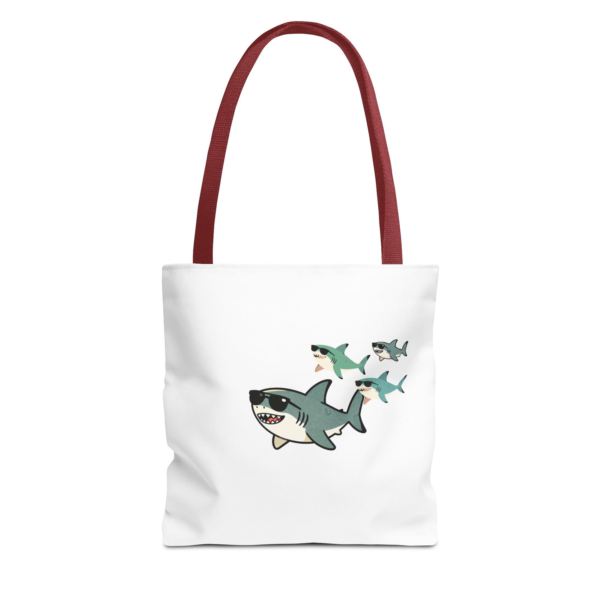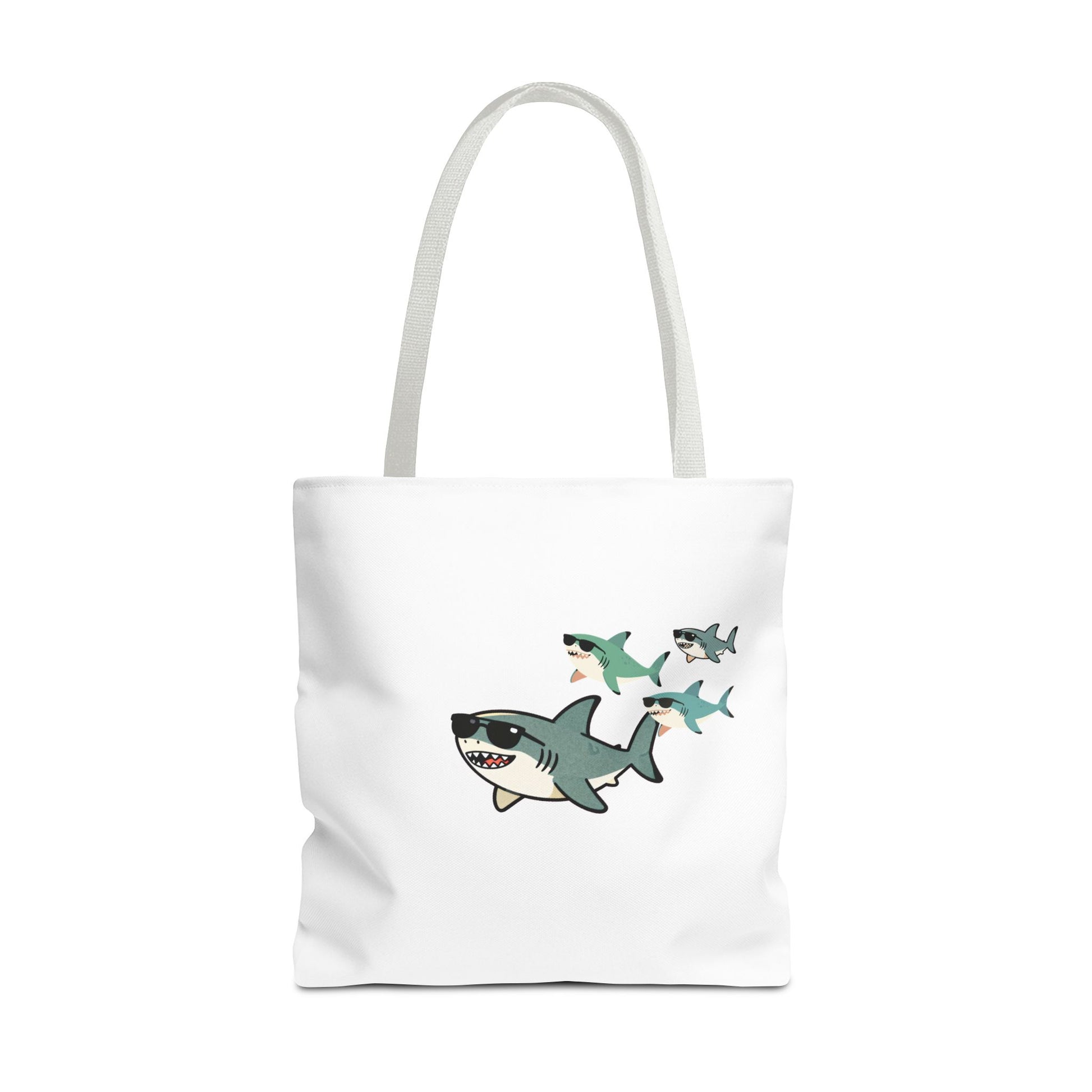 Carry your essentials with ocean attitude using this spacious tote bag. Designed for those who love sharks and the sea, it features charming artwork of a shark family—a parent leading three little ones on their underwater adventure. Whether you're heading to the beach, grocery shopping, or running daily errands, this tote makes a perfect companion for your busy lifestyle.
