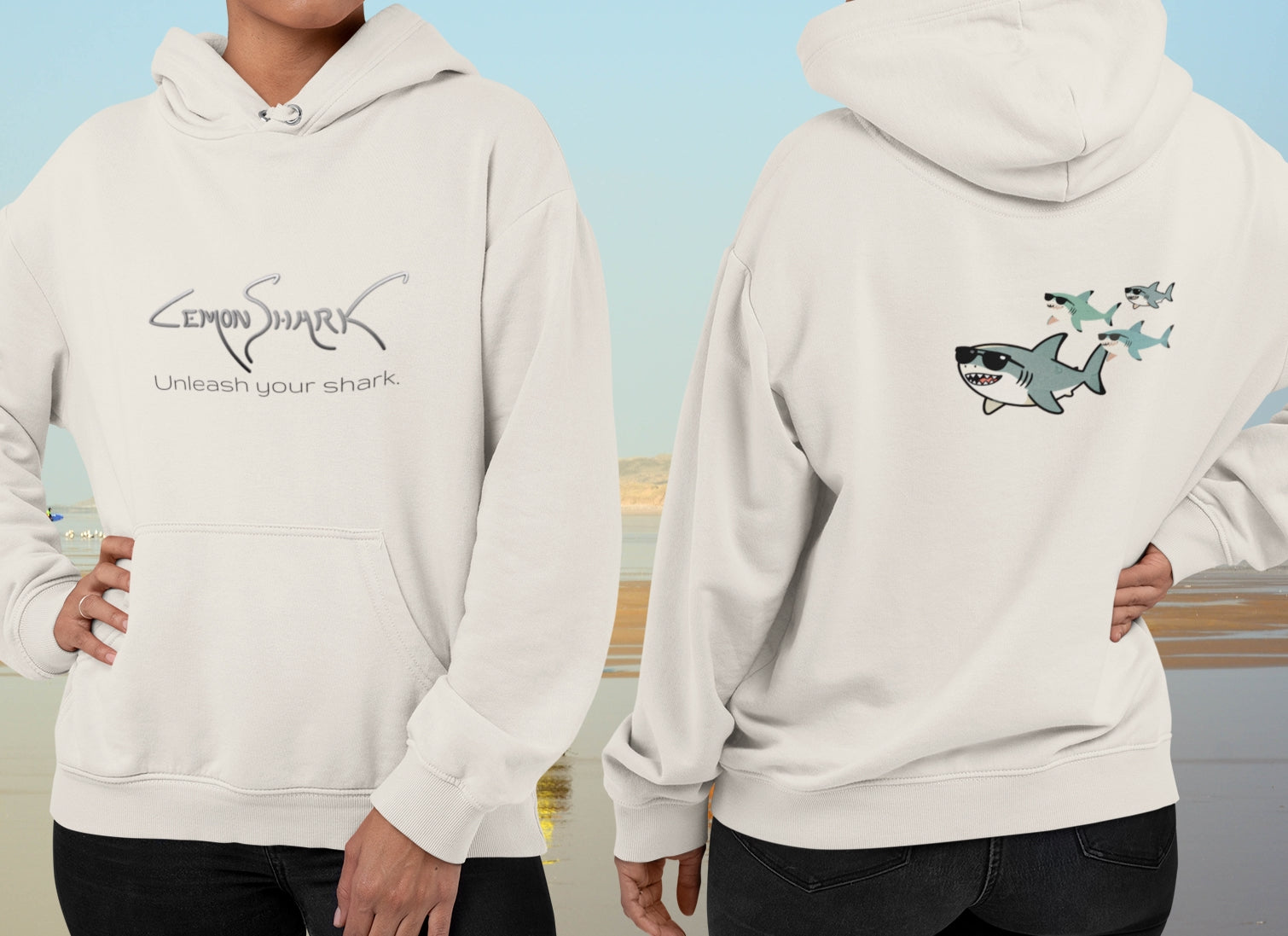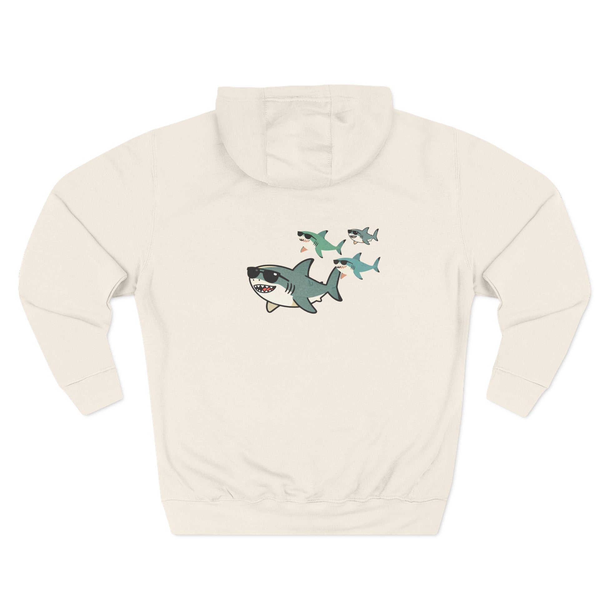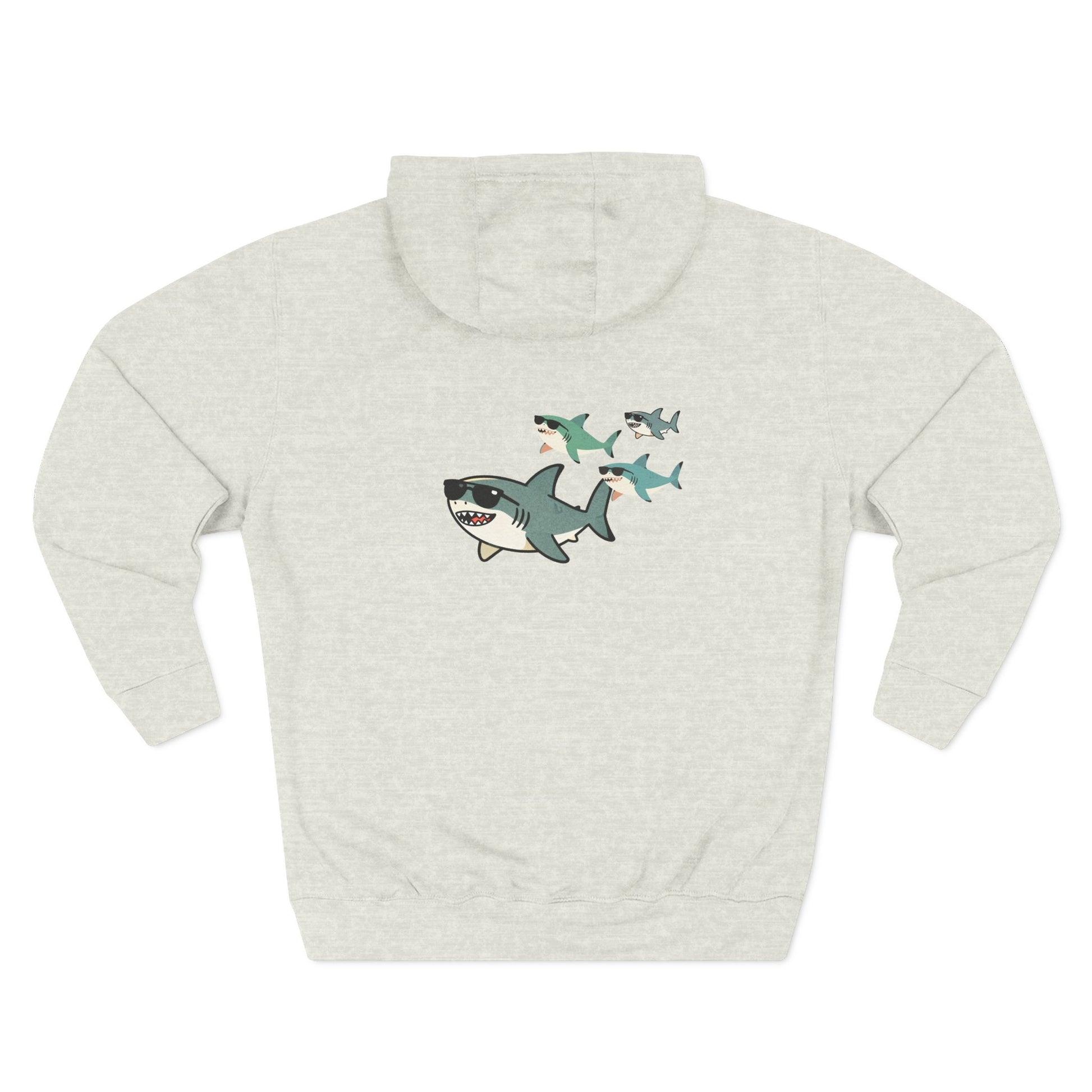 This hoodie tells a story before you say a word. On the back, a shark dad leads his three little ones—maybe twins and a younger sibling—through the deep blue. It's a family moment of ocean life. On the front, the Lemon Shark logo keeps it simple.
